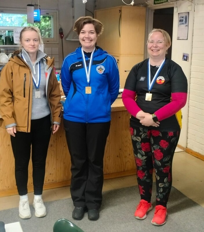 25m vakiopistoolin mitalikolmikko. Vas. Sonja Aaltonen mestaritar Elina Silver ja Marja-Liisa Tahvanainen.